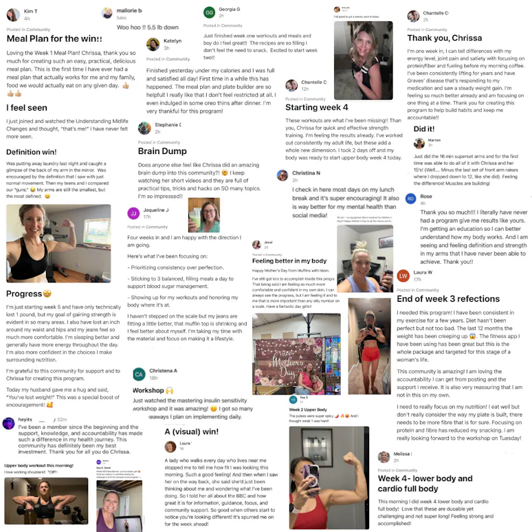 A: If you’re a woman over 40 who wants tone up and lose fat and get in the best shape of your life - while also nurturing your changing hormones so you can feel amazing inside and out, this is the place for you. Inside, we cover ALL aspects of perimenopausal health and weight loss from nutrition and fitness to hormones, stress, and mindset. And you’ll be getting the community support you need plus coaching from Chrissa herself to make sustainable life habits whether your goal is weight loss or just prioritizing your health and fitness - setting the foundation of optimal midlife health and beyond.
